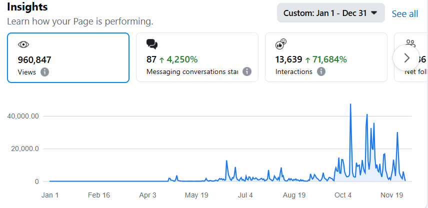 Almost 961k views. That is incredible. Our first post on the Facebook Page was on May 3rd. Considering that this is really only 7 months of activity, this is an incredible number. We went from 0 followers to over 1400.