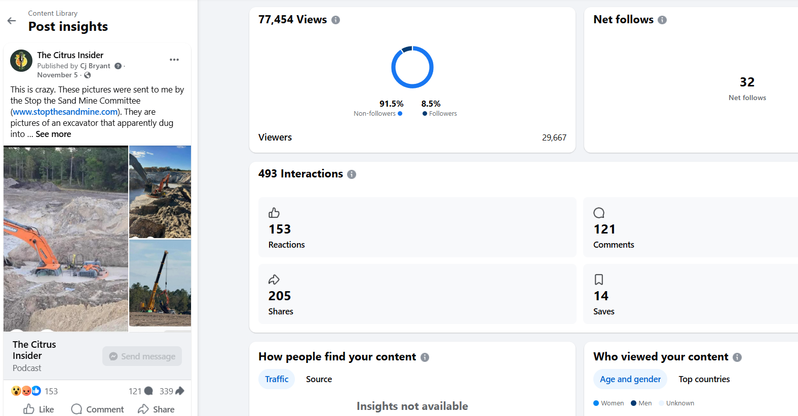 Our most viewed post in 2025 was the excavator picture we posted after it was sent to us by the Stop the Sandmine group. This was the excavator that stuck when the hole it was digging got flooded by ground water.