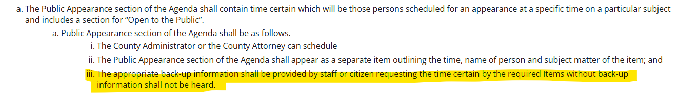 The county has administrative regulations on how items are added to the agenda. They can be found here if you wish to take a gander.