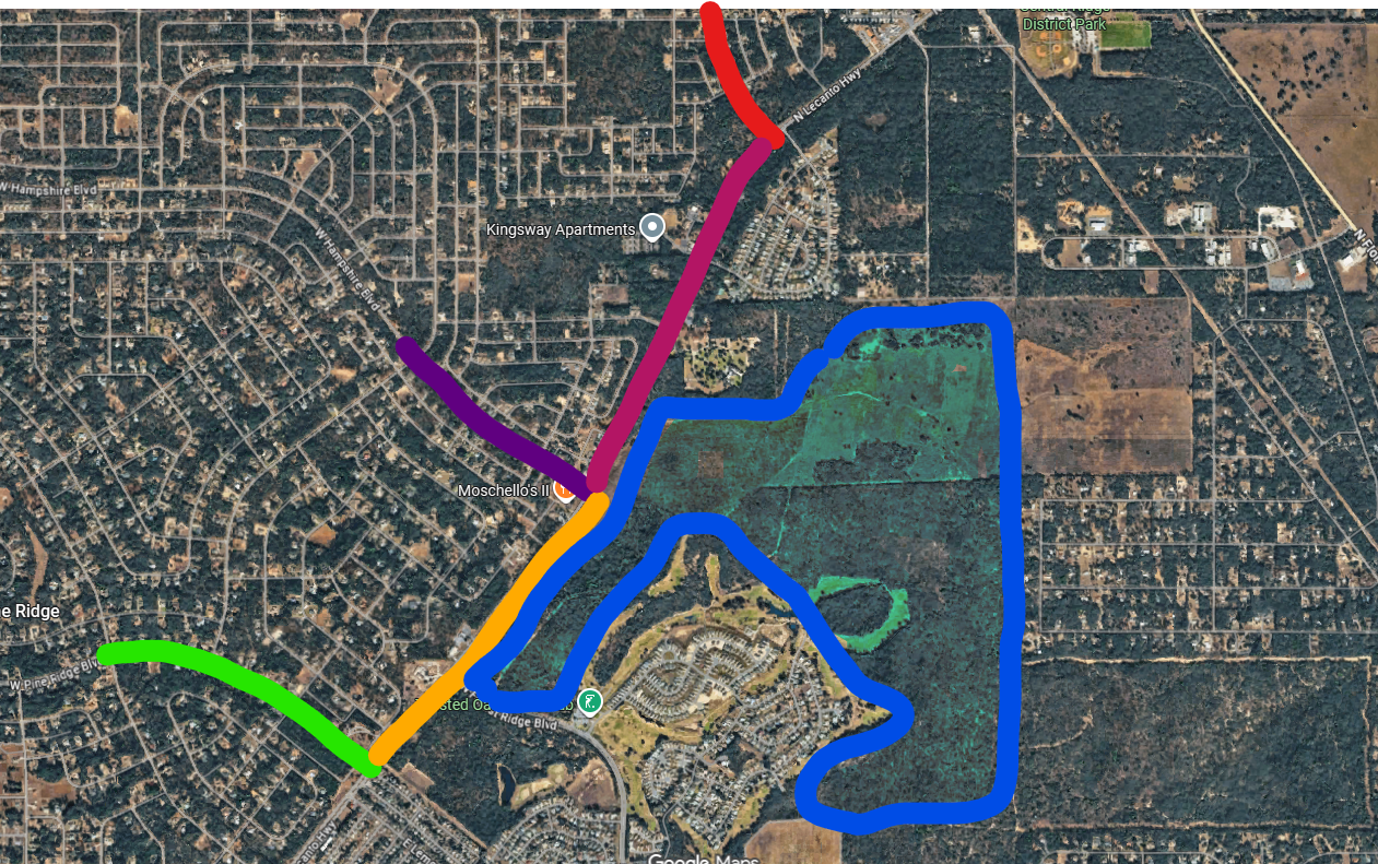 The orange color is the proposed 3rd phase... from Pine Ridge Blvd to Hampshire. The magenta line would be the expansion from Hampshire to Deltona. The Blue area is the recently approved Tuscany project.