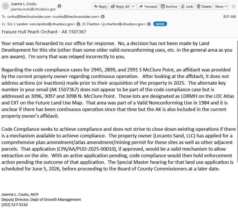 The county appears to be changing their mind. Apparently they now realize they cannot use his attestation letter to satisfy the LDC requirement of continuous use without lapsing for a year. They also realize that the site is now not in compliance with the LDC and thus, subject to code enforcement.