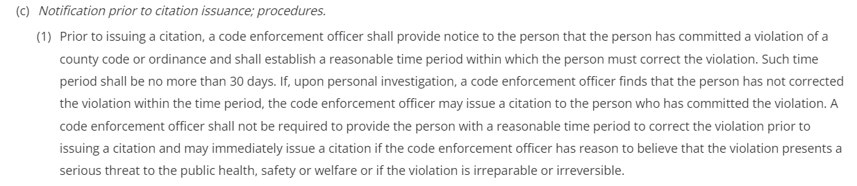 Normally, this would be a pretty big deal. Code enforcement would do their thing, note the non-compliance and issue a letter stating they have 30 days to rectify it.