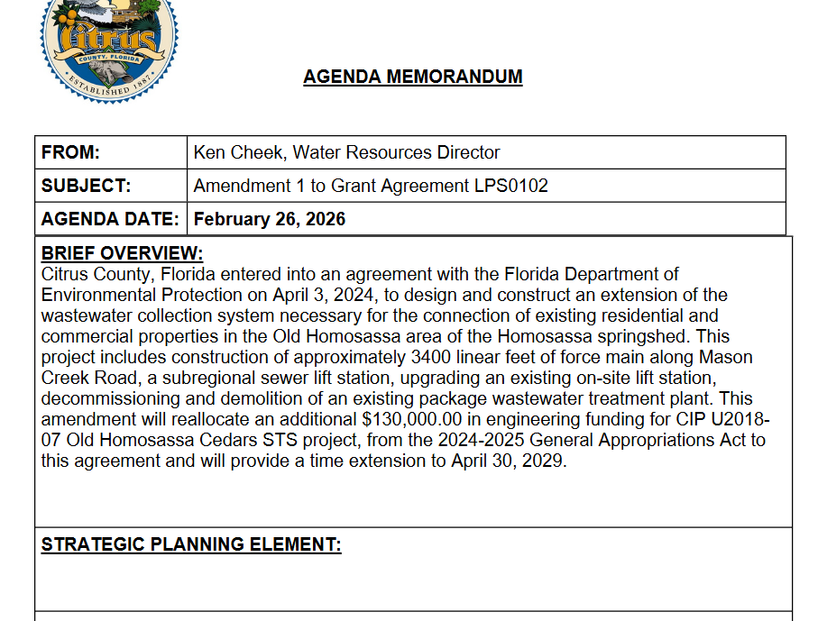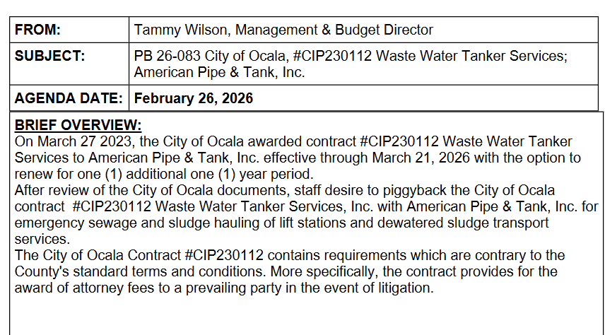 The county is once again doing a piggyback contract with another government. This time we are piggybacking the City of Ocala for wastewater tanker and wastewater plant needs.