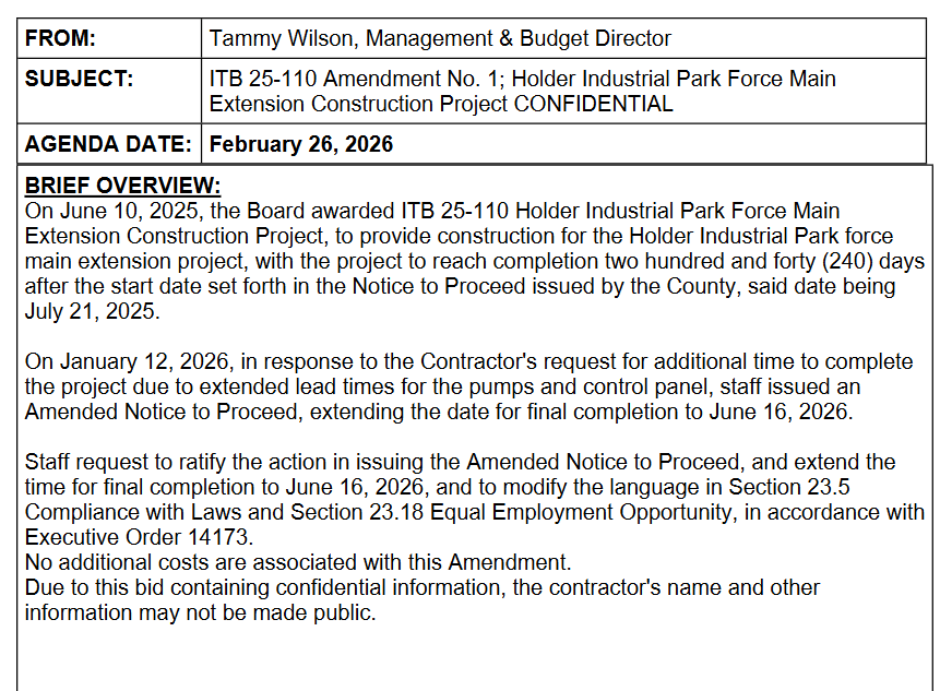 Why is this contractor excluded from disclosure? This is the project to provide water services to Holder Industrial Park using the grant Governor DeSantis gave us a couple of years ago.