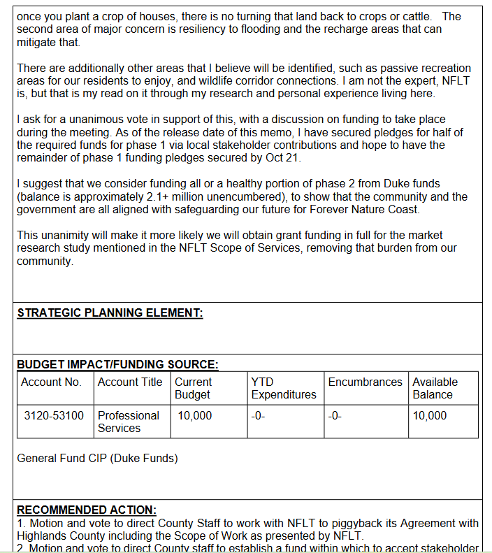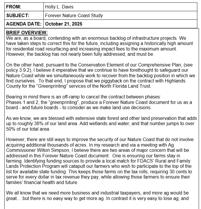 If approved, the idea here is that this company, North Florida Land Trust, will create a document that can be used by the BOCC to help guide growth with conservation in mind. We hear all the time that we are "losing the nature coast" with all the development approvals. This process will provide a tool for the county to use in making those decisions.