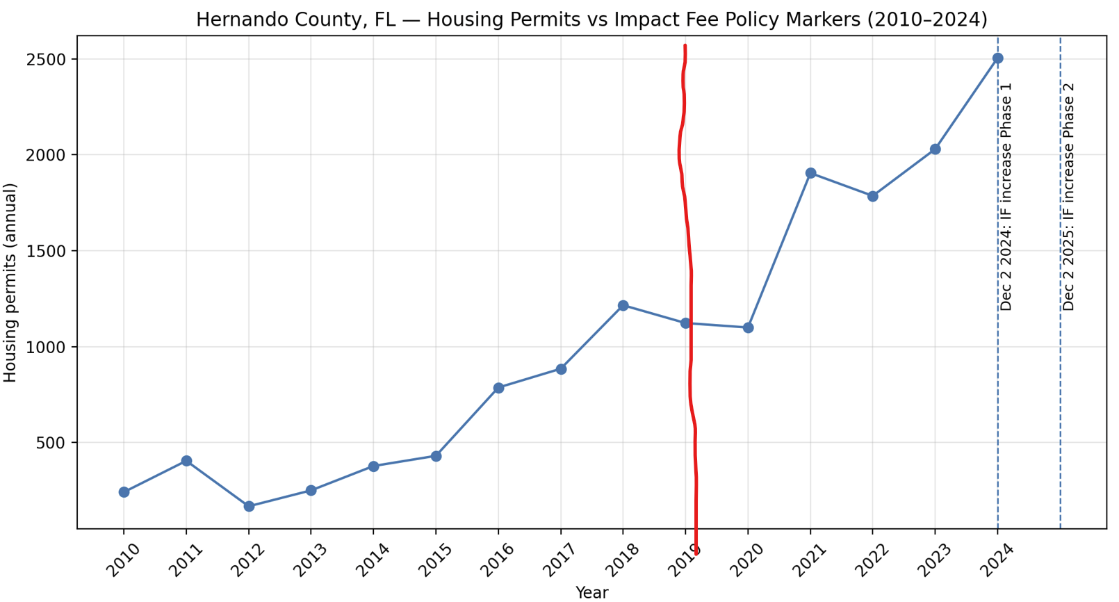 Sounds good in theory, but not in observation. You see, we raised the impact fees in 2021 and we did not see a reduction in permits as a result. In fact, they skyrocketed, reaching 2,443 in 2024. I do not have 2025 numbers yet, but I expect them to be higher.