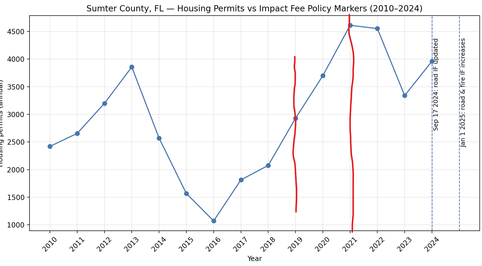 Sumter is the only surrounding county that has seen a decline since the most recent impact fee increase. Notice, Hernando and Marion have both seen increases in building since their fees were updated. The lines in red show the recent impact fee increases.