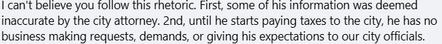 I admitted that to the council at the meeting on Monday. I said that is why I did not feel I had the "right" to say that she should be fired or keep her job. I did not weigh in on that. However, I thought it was fair to point out flaws in the government process to maybe help them fix those things, if they agreed they were issues.