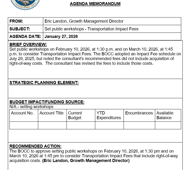 This is under consent agenda, so do not expect too much discussion. The idea here is that they want to bring back impact fees for a review because when they raised them back in July of 2025, they did not have the right of way acquisition costs factored into the fees.