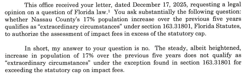 However, the Attorney General of Florida issued an opinion recently against Nassau County who was trying to raise impact fees using growth as the reason.
