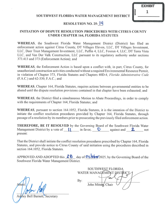 SWFWMD formally voted 11-0 on October 28th to enter into those proceedings with the county.