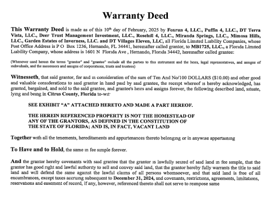 First, it appears that Matser (Van der Valk) has purchased many of the remaining lots from Van Usen under a new LLC called MB1725, LLC. Remember, Van Usen was the largest land owner in IV4. The county has claimed in its letter to Ashley Moody that there was a "common scheme to defraud" involving Van Usen and Matser. Basically, the allegation was that Van Usen would sell lots and require buyers to use Van der Valk to build.