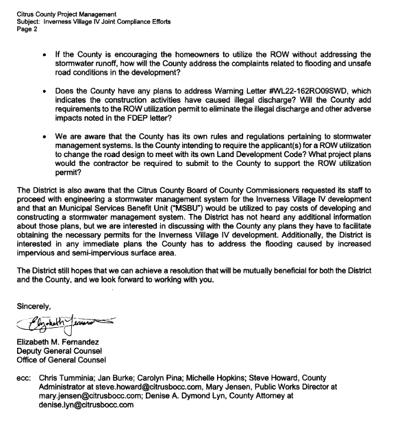 That is going to come back in play during the SWFWMD lawsuit.... the county was told about the issues but did nothing to address them... even though the court ruled in the 2011 case that the roads/drainage were the responsibility of the county, but they could determine how to pay for them.