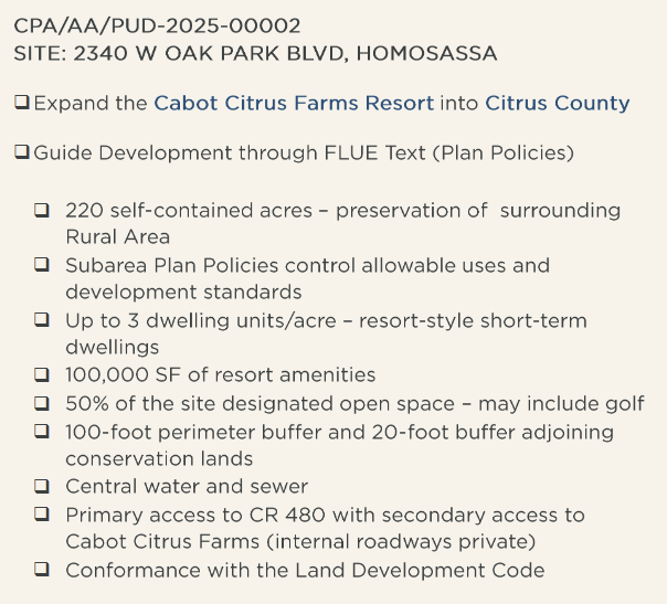 The big talk will be about Cabot Farms and their desire to create a new land district call CCR... Cabot Citrus Farms Resort. If approved, this new land district will take the place of the current RUR zoning.