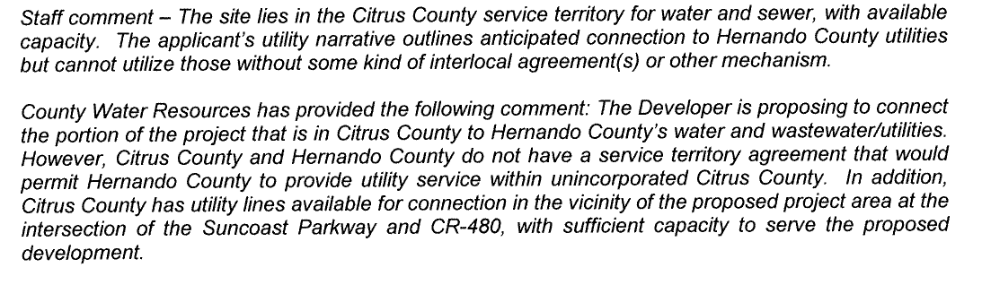 Further, the project proposes to connect to Hernando County water and sewer facilities. Staff is concerned about this as it will require some type of interlocal agreement with Hernando County that has not yet been discussed. Citrus has capacity to handle this project, but cited the need for upgrades to the system to have the ability to service this project.