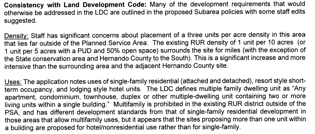 I do not see how the PDC approves this project based on what is in here. Far exceeding the density of the area outside the PSA in the most rural area of the County is asking for chaos. Just because Hernando County approved their side of it does not mean Citrus needs to follow.