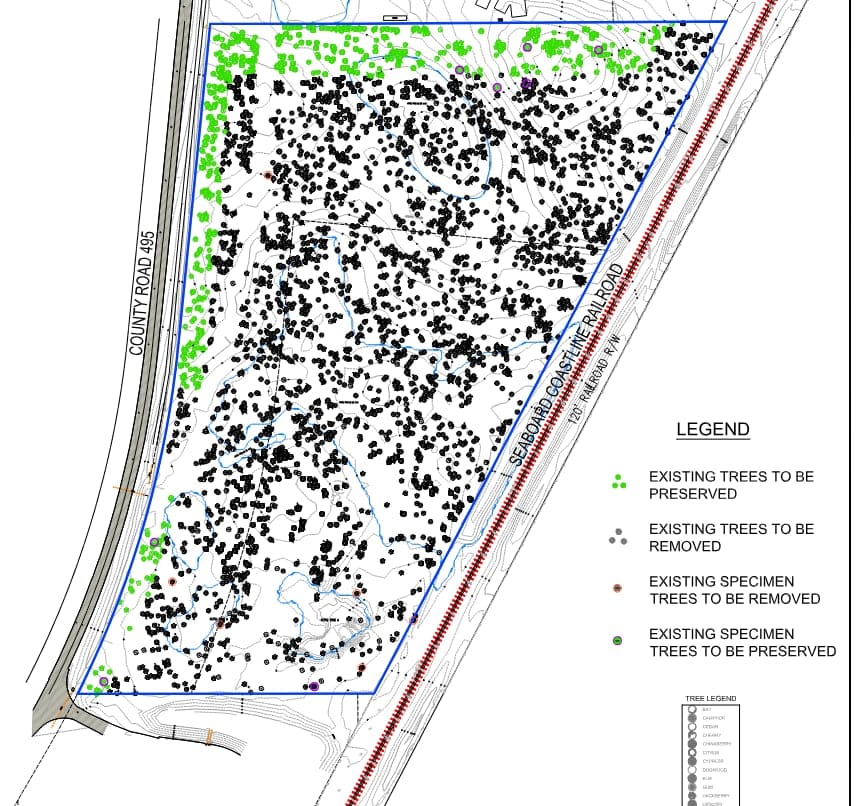 All the black dots... trees that will be removed. Based on our tree ordinance, these will need to be replaced elsewhere or paid for to allow the county to plant elsewhere, but still... clearing the entire lot pretty much of mature trees to plant some saplings somewhere else.