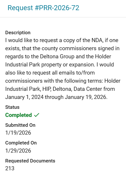 That also explains the urgency to get this to the PDC. Going from application to the PDC in 3 months is not normal. Also, remember Tallahassee is proposing legislation to regulate data centers. If passed, that likely goes into effect in June/July. If the changes requested as part of this application are approved in April, that gives time to go to permitting before the new laws... thus... a grandfathered in data center under current laws.