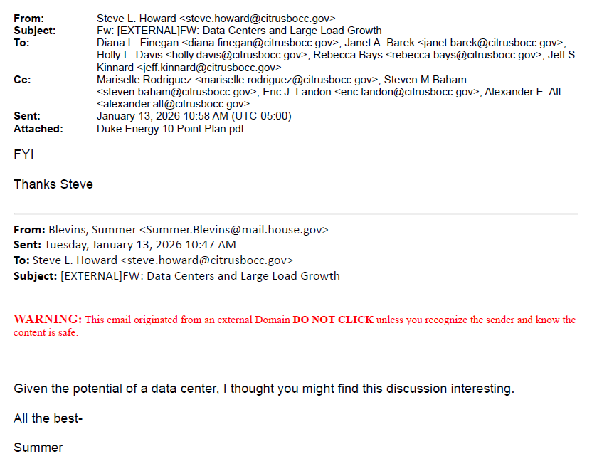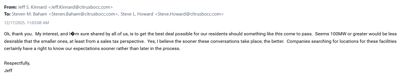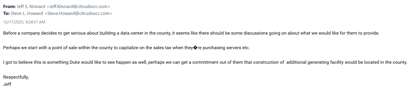 There is an email from Commissioner Jeff Kinnard to Steve Howard on December 17, 2025 regarding a data center.