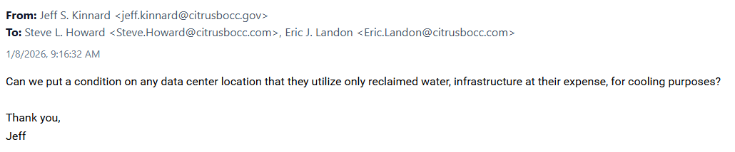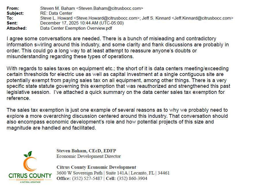 Ok good news is that they all agree that we need to have the discussions on what data centers look like here in Citrus County. I had mentioned the need for that recently as well.