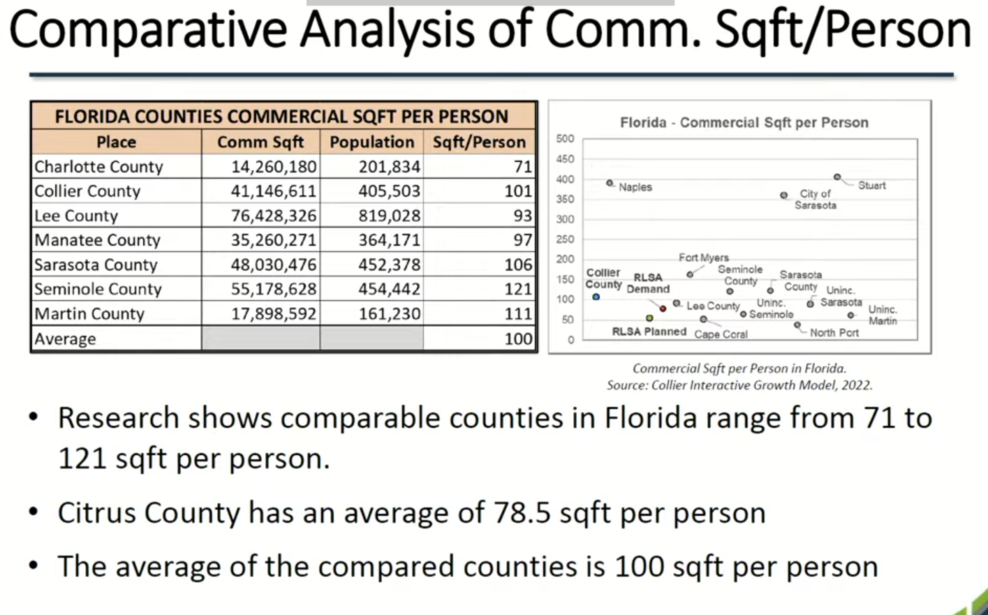 This one shows demand for larger type shopping centers through 2050. It is suggested that we will need 4 more before then. This next slide shows how much commercial square footage that we have per person. Currently that is around 79sqft per person. He would like to see us closer to 90sqft per person.