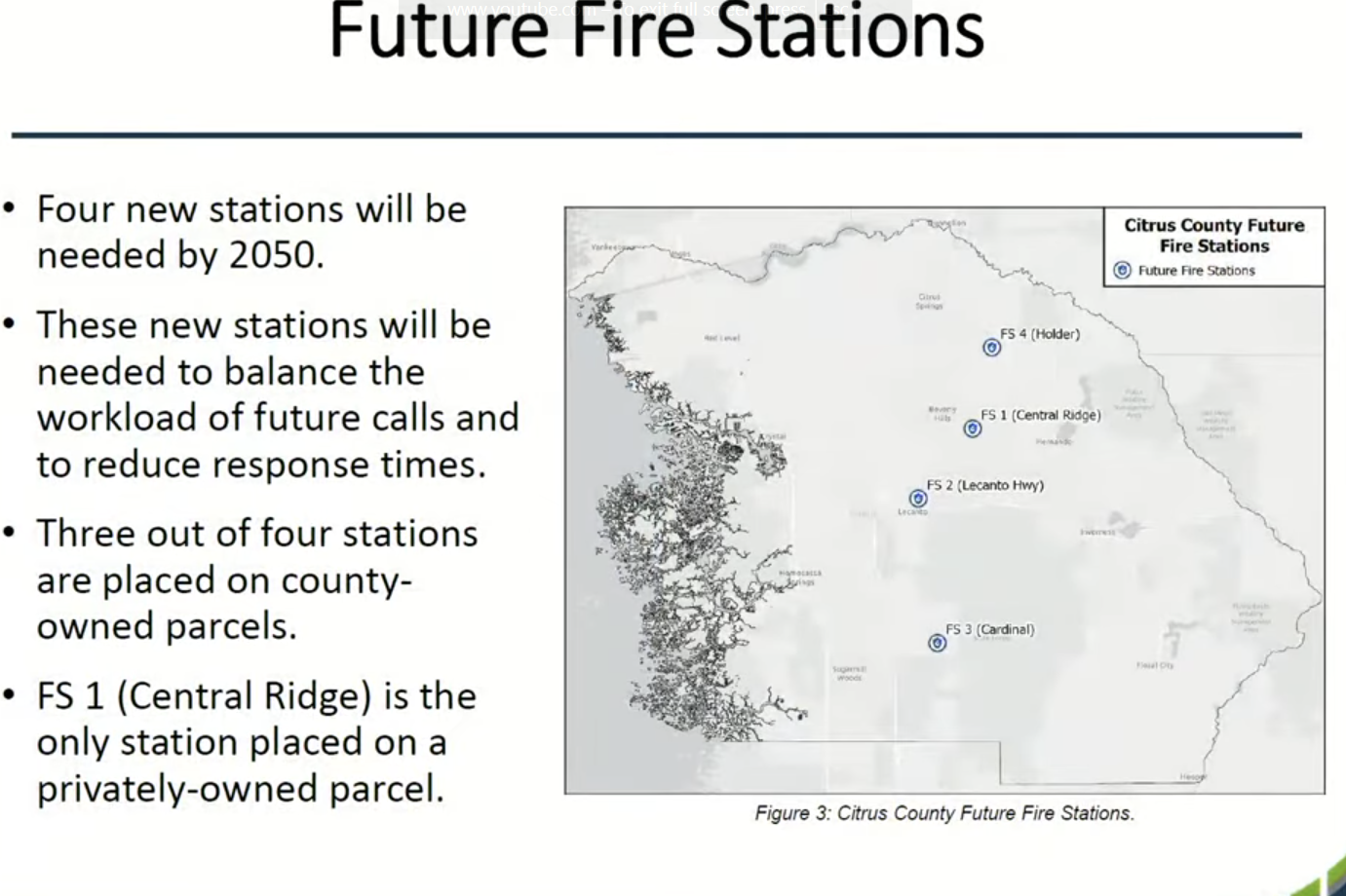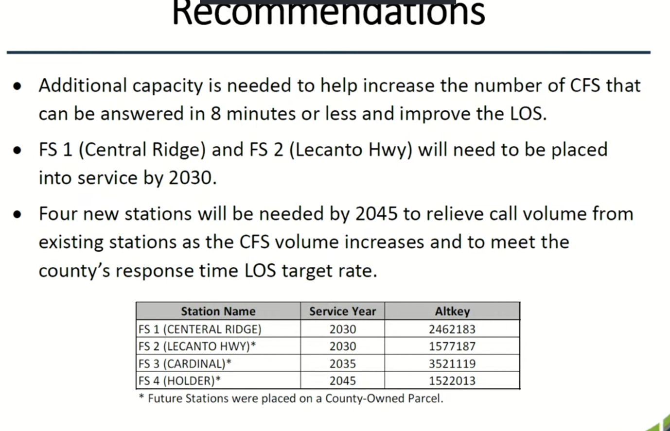 It is suggested that we will need 4 more fire stations before 2050 to service the number of calls we will have from continued growth. He goes on to say that 2 of those stations need to be built by 2030.