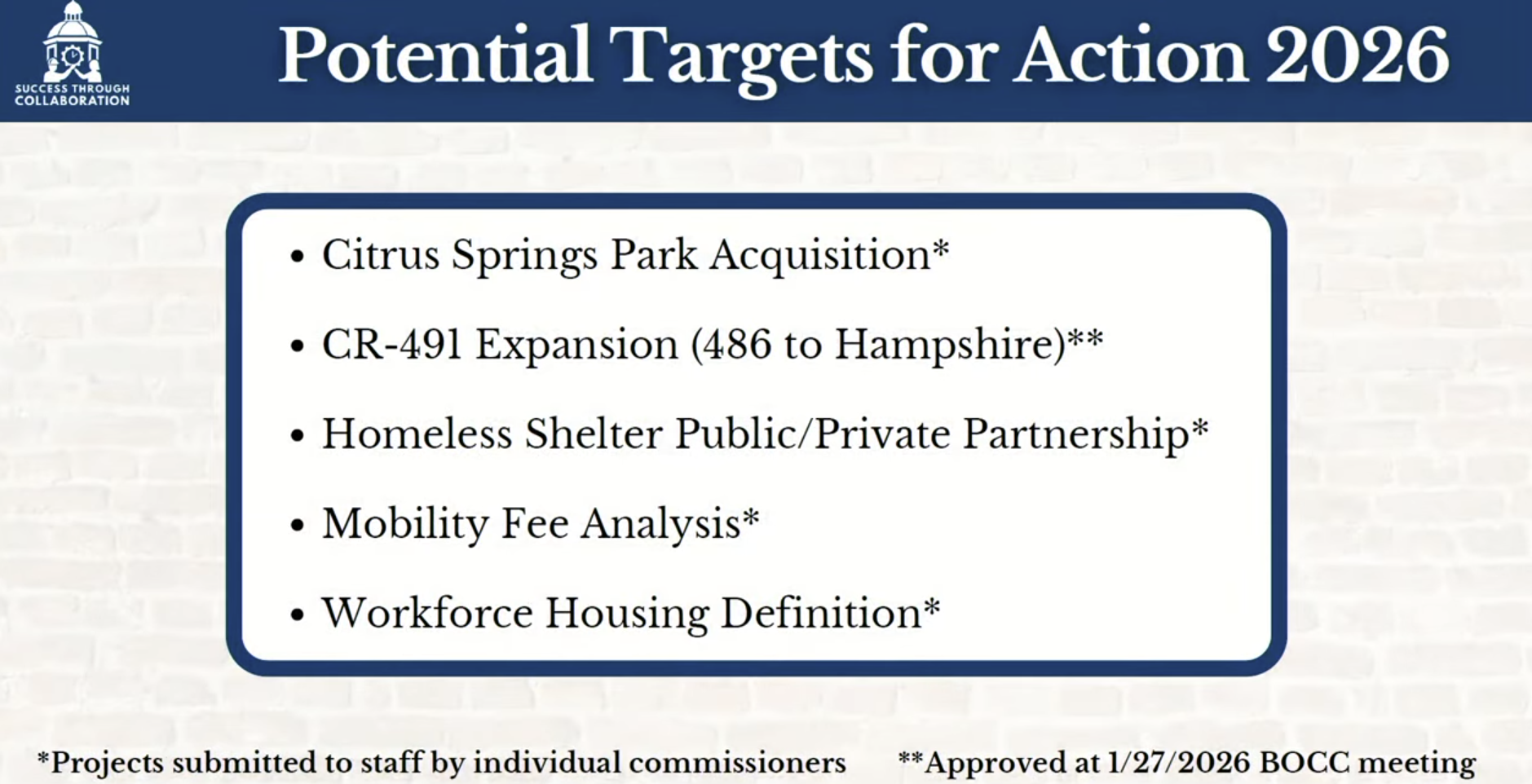 I want to chat a bit about the Strategic Planning Workshop that took place on Friday. This is the yearly meeting where commissioners get together and talk about things they want to accomplish in the near/long term future. These are generally high priority items like roads or the animal shelter.