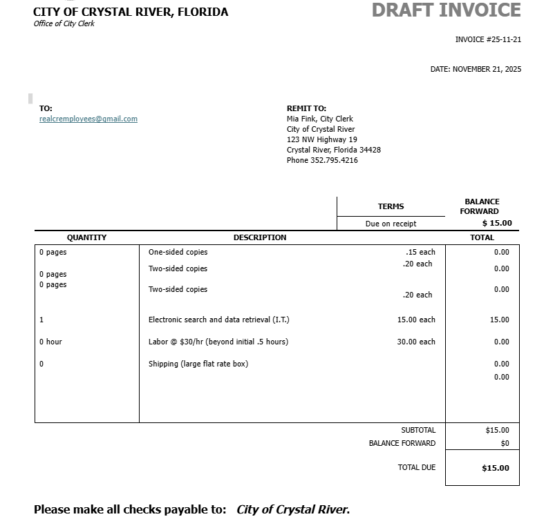 I was contacted by someone who is having issues with a public records request with the City of Crystal River. This is the records request they made: