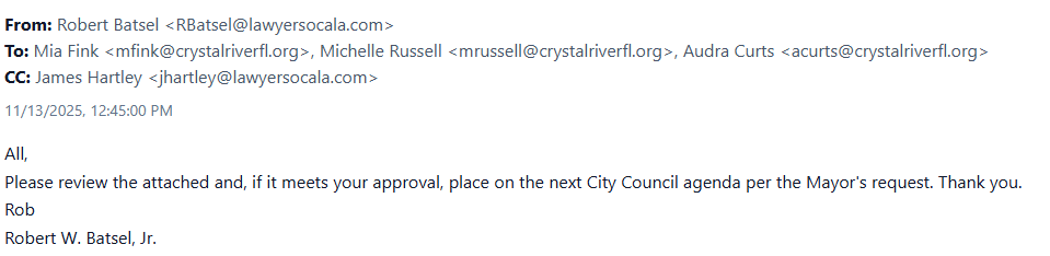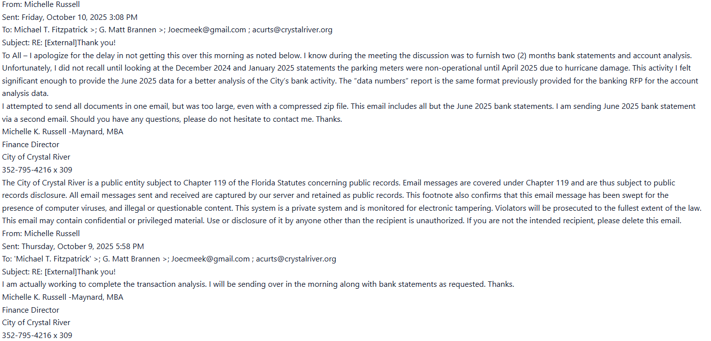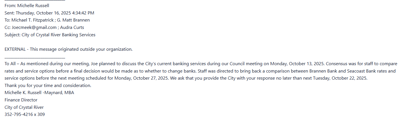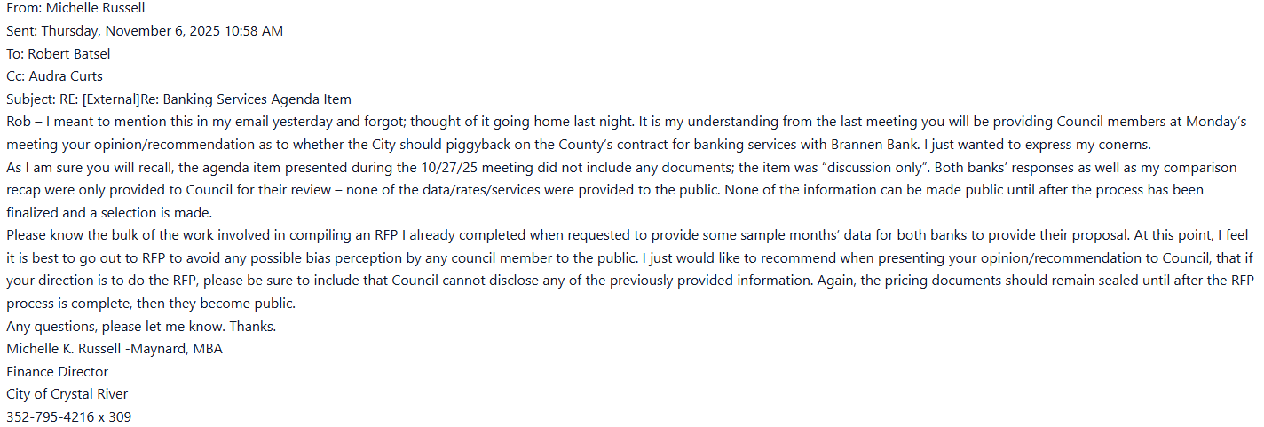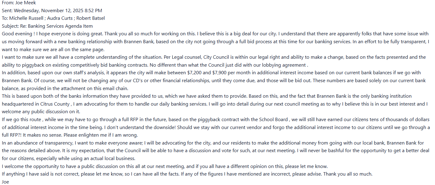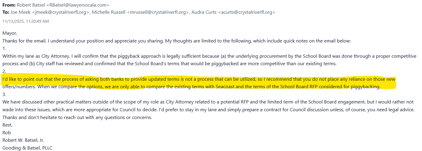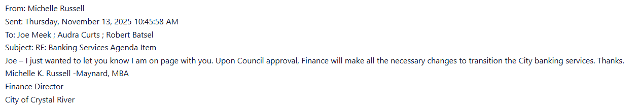 In his Nov 13th email above to Joe and staff, Batsel acknowledges conversations he has had with Joe regarding the banking contract but does not go into those as he wants to stay in his lane as city attorney.... so what were those conversations? And why is he having a conversation with the mayor regarding the banking services that is outside his scope as city attorney?