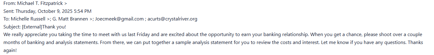 It appears that city staff had a meeting with Brannen officials on October 3rd. In this meeting it looks like city officials talked to Brannen about their banking services. Despite asking for all emails regarding the banking issue, I have not seen an email initiating this conversation. Either it was not done via email or they did not send it to me.