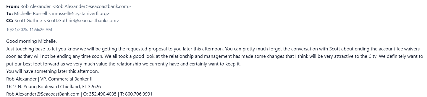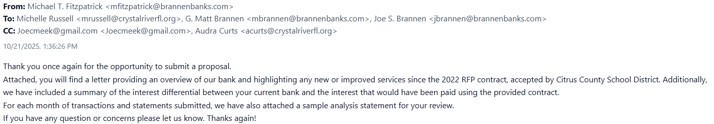As mentioned previously, the City of Crystal River opted to go this route to avoid the RFP process. This allowed them to hand pick Brannen Bank for the banking services for the city. At the December 8th Meeting, the council was told that this switch would bring an additional $5500 per month in interest income.