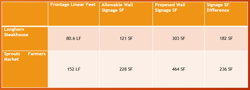 For Sprouts, they want 464 square feet of signage. They are allowed 228 square feet. This is 103.5% more signage than allowed under LDC.