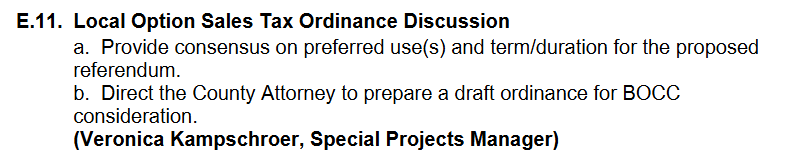 The board had "consensus" to direct county attorney Denise Lyn to create the referendum language to get sales tax on the ballot. I use quotes because this word will come into play in a bit.