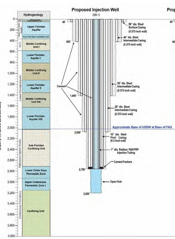 The idea here, instead of collecting it in tanks to take to wastewater treatment plants, they will pump it out of a deep injection well. This well will be over 3,000 feet deep. According to the documents, the bottom of the Florida Aquifer sits around 2,000 feet. This proposes to go well below the aquifer primary confining zone into what is called the Lower Cedar Keys Permeable Zone and Upper Cretaceous Permeable Zone 1.