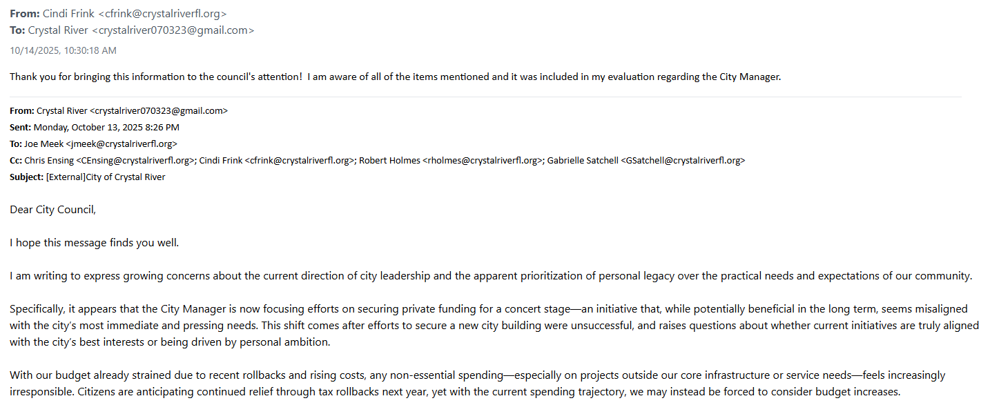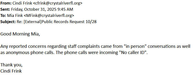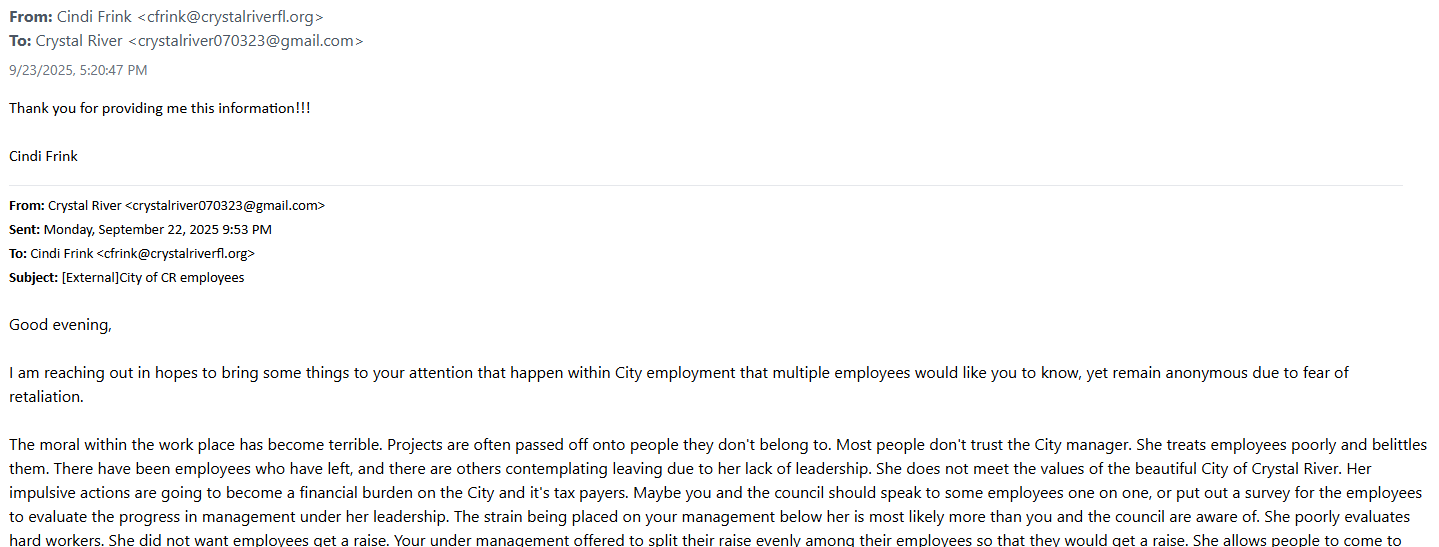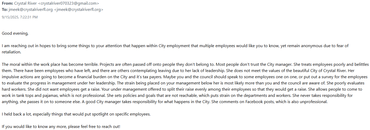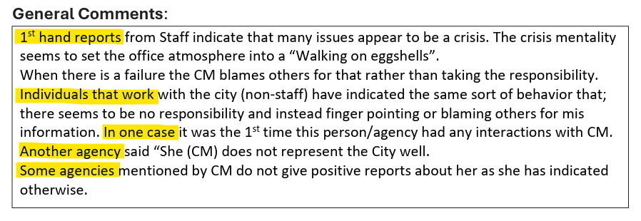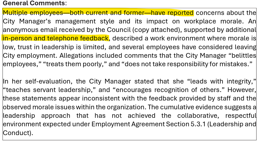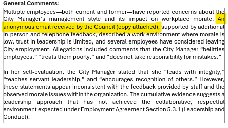 Why was staff not concerned about repercussions back in 2024, but now, so concerned about their current boss that they cannot write a similar letter expressing their concerns and using their names? They had to go behind the scenes in secret to two city council members? Only utilizing two *67 phone calls and in person conversations... no text messages or emails?