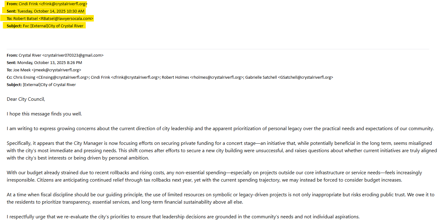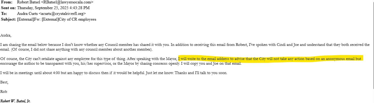 There is a separate email from City Attorney Robert Batsel that indicated the city cannot act on anonymous complaints.