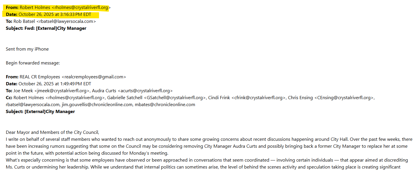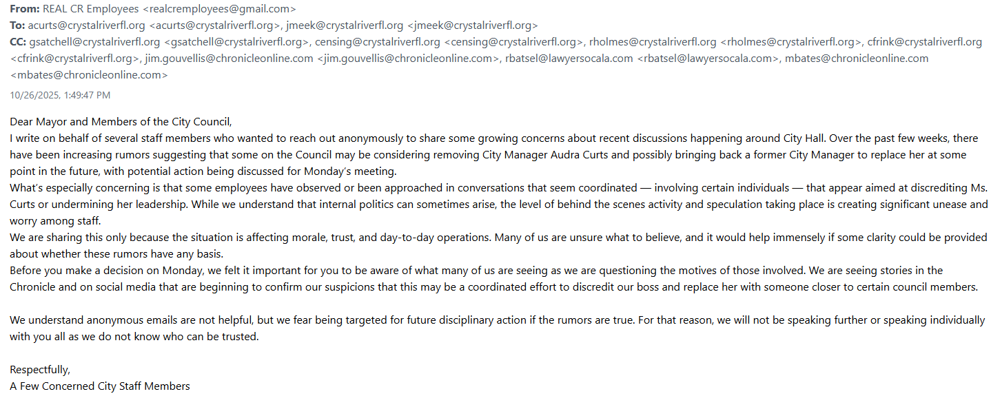 This email was sent to all council members and the mayor. There would be two other emails from the same email address that referenced several different issues within the city and why Curts needed to go.
