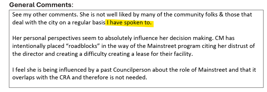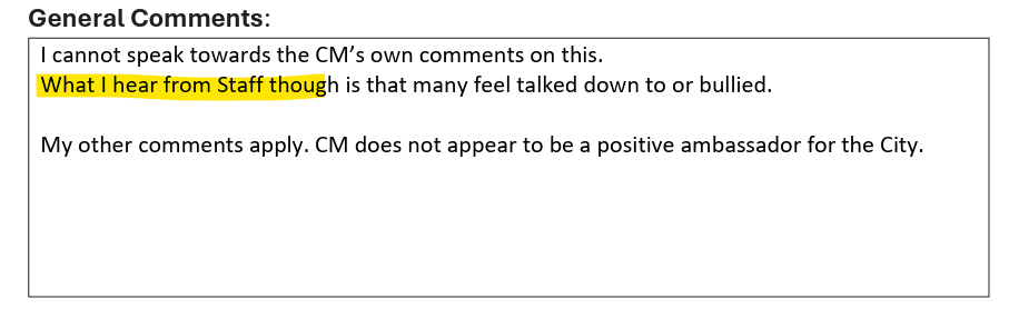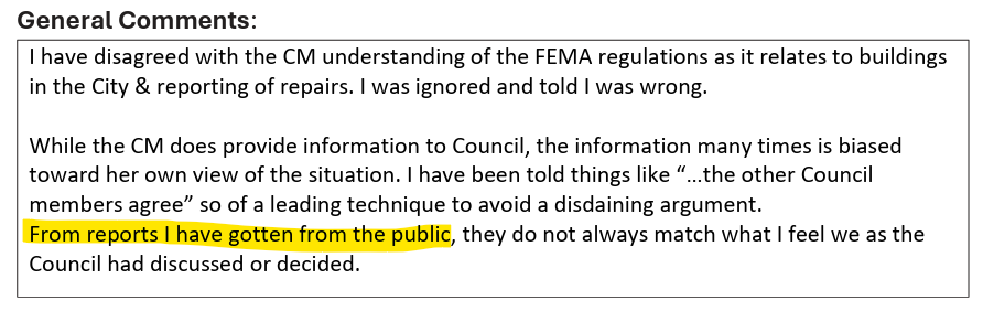That brought me to another point. In the evaluations, City Council member Chris Ensing mentioned a few times that he received reports and whatnot from people regarding Curts.