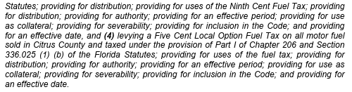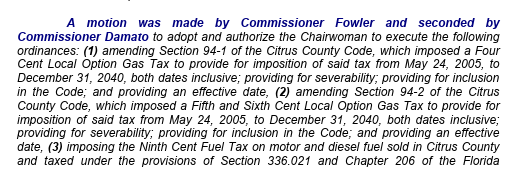 One myth I would like to clear up. Voters did not vote for any fuel taxes in Citrus County that I can find. They do not appear on the ballot. They were all implemented by ordinance by the County Commission, which is allowed by law.