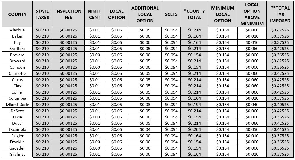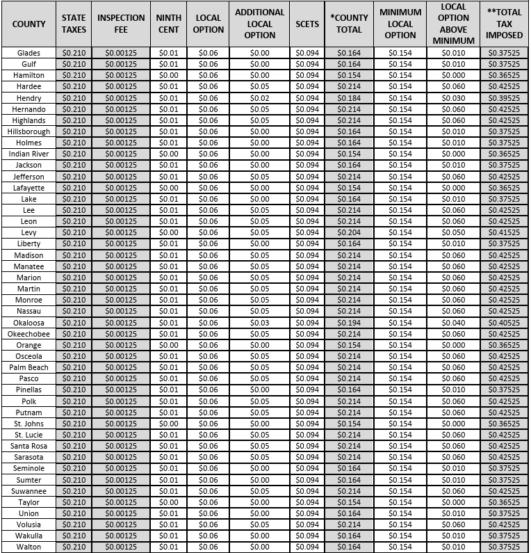 - First Local Option allows counties to implement a sales tax for up to 6 cents per gallon.