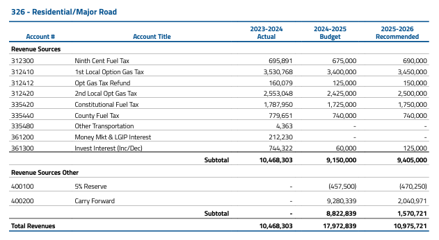 As you can see, gas taxes are supposed to bring in $9,405,000 in 2025-2026. There is a carry forward amount of $2,040,971, which is money not spent the previous year. Subtract the reserves and you are left with $10,975,721.