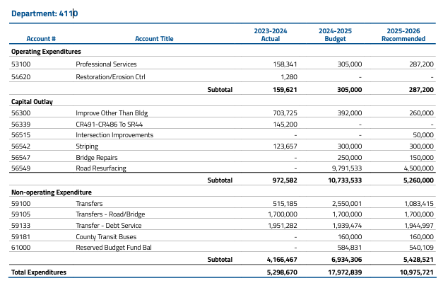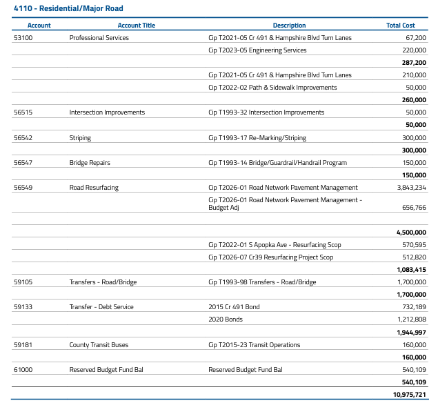 You will see in 56549 that we are using $1,083,415 for SCOP projects. These are funds needed to match state grants to help resurface collector roads. South Apopka and CR39 are listed here for 2025-2026.