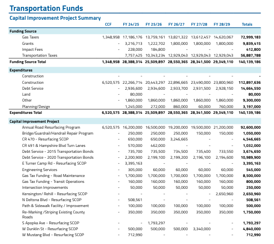 Here you can view the projects in the 5 year CIP. There are roughly 20 pages of transportation projects that fuel taxes can be used towards.
