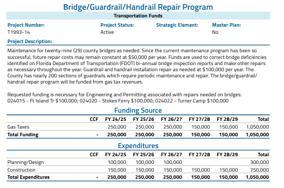 So you can see specifically that the gas taxes are going towards things they are allowed to go towards and not going to some pet project of a commissioner.... unless a commissioner is drooling over guardrails or pavement striping.