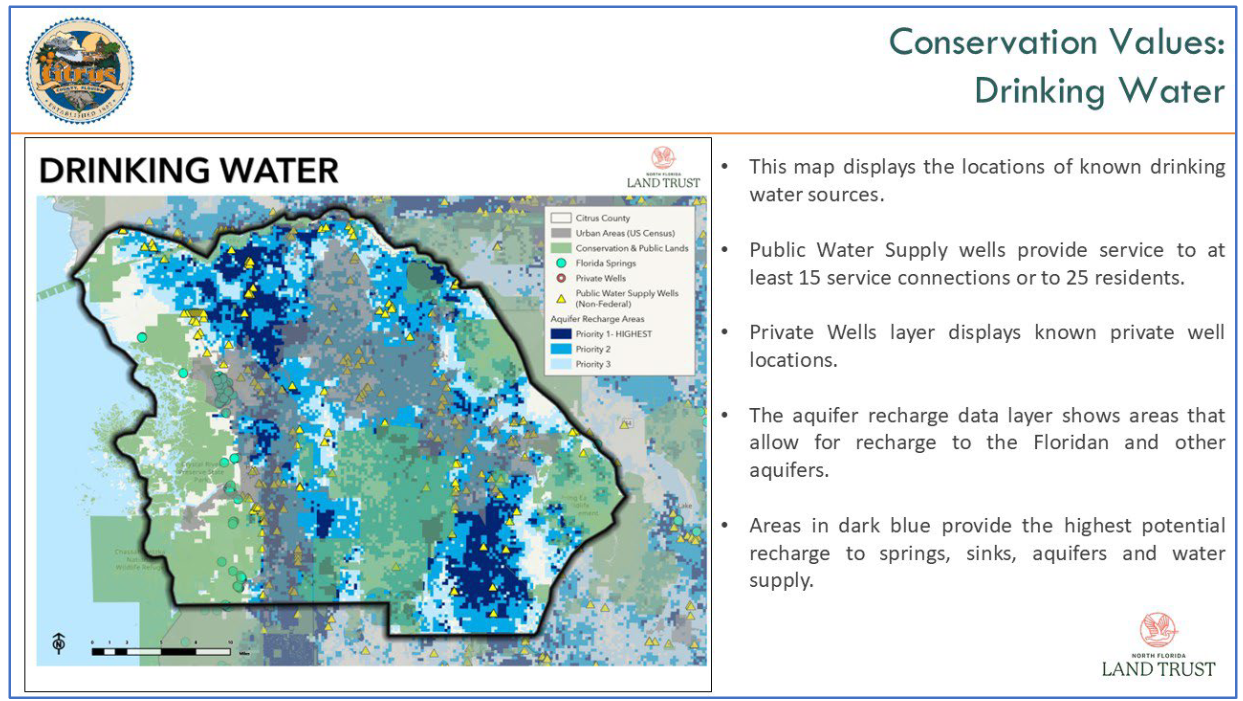 More importantly, they need to ask how this will affect THEIR citizens in Crystal River. Below is a map from the North Florida Land Trust that shows our drinking water and where it comes from. Those dark blue areas are our highest priority zones.