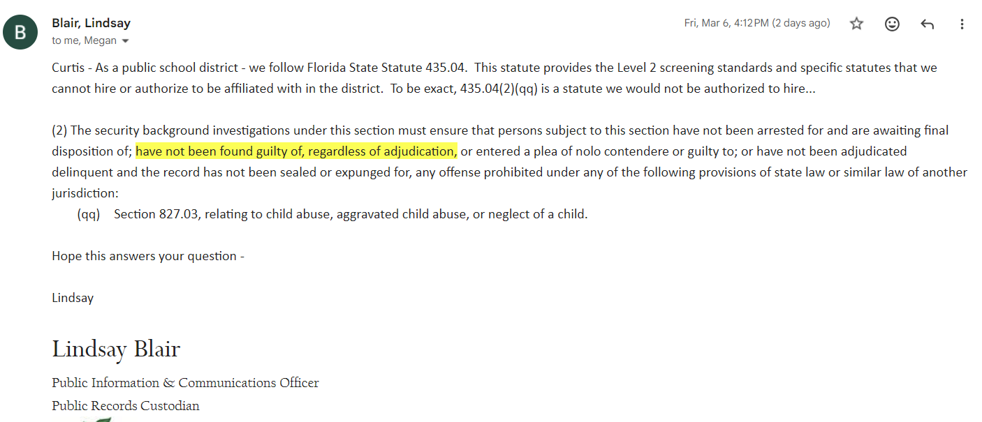 Notice the highlighted portion. It does not matter if she was adjudicated and is no longer convicted of that crime... she would still fail the level 2 background check at the school district... and notice the reply includes the Section 827.03 that I had asked about. The background checks ignore adjudication.